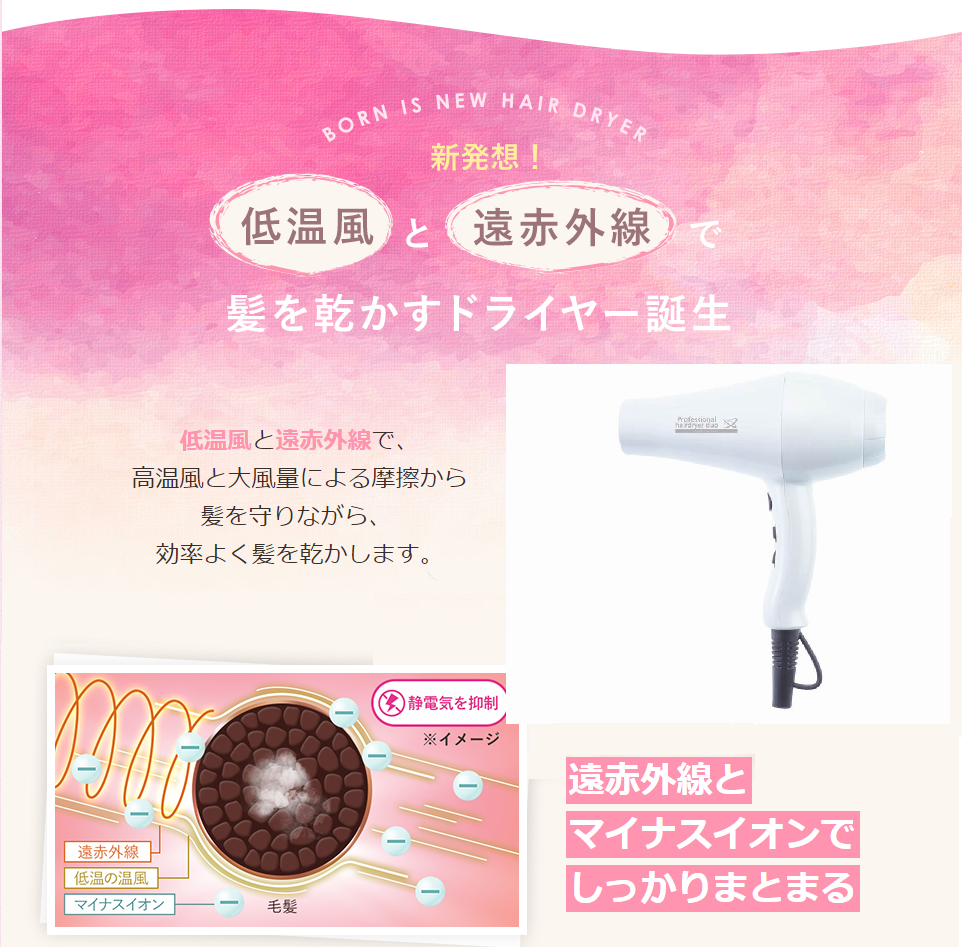 【遠赤外線&マイナスイオン搭載】プロフェッショナルヘアドライヤーデュオ (1200W)