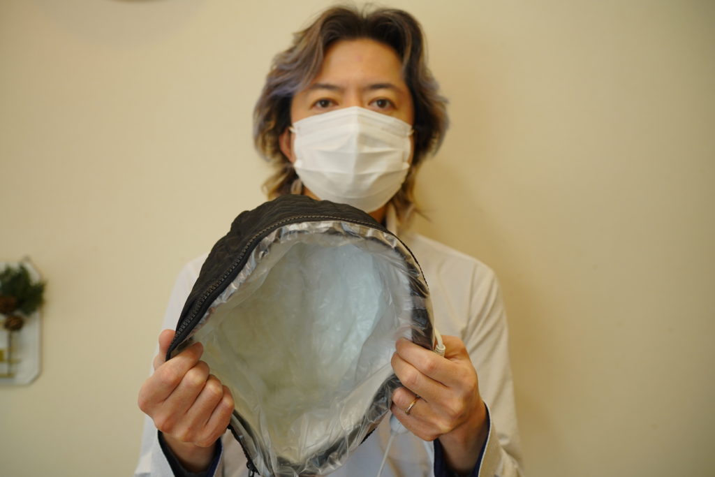 ②頭皮にクリームを付け温熱帽子で温めます。