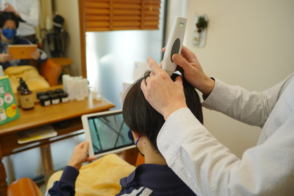 ①最初に頭皮用マイクロスコープで頭皮&毛穴チェック!!