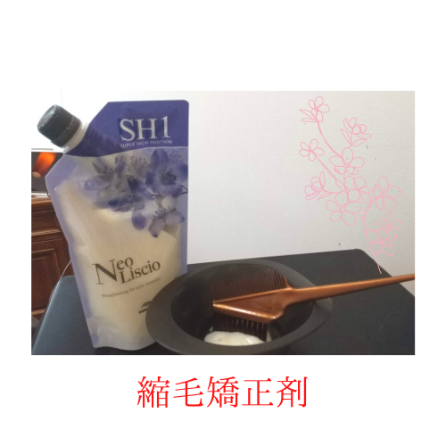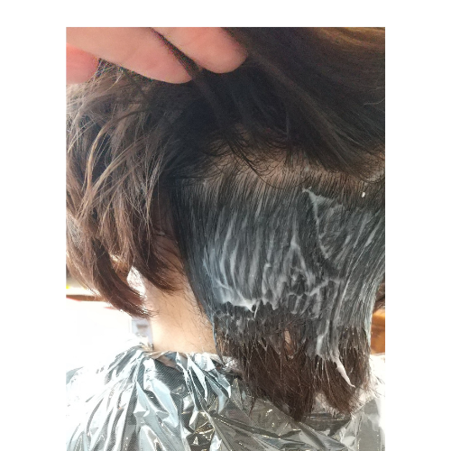 今回はこちらの縮毛矯正の薬剤を使用します。浮いてしまう襟足付近だけに塗布します。