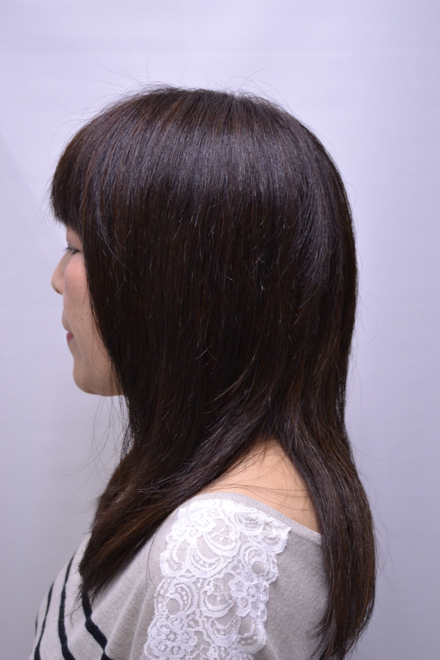 毛量を抑えるため均等の梳かず、あえてハサミで間引くことにより多毛の方でも、広がりをおさえ、すっきりとして手触りのよいスタイルになります。カラーツヤ感を出すためダークトーンのブラウンをのせました。 多毛の方、クセがありひろがりやすいロングの方お勧めです。